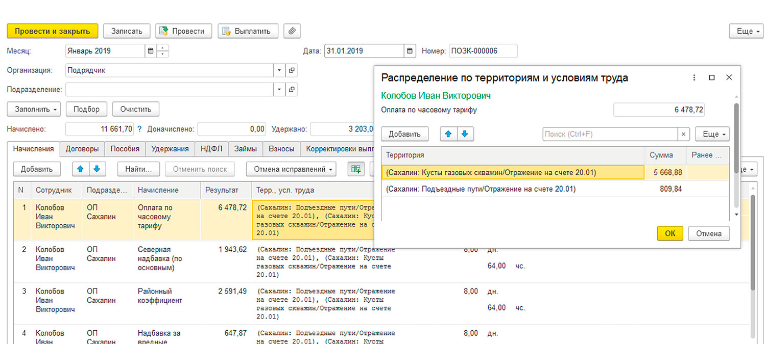 - Отражение больничных и отпусков по объектам пропорционально основной заработной платы или по последнему объекту, на котором работал сотрудник.